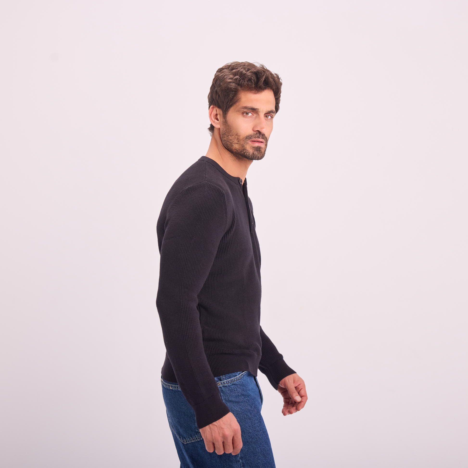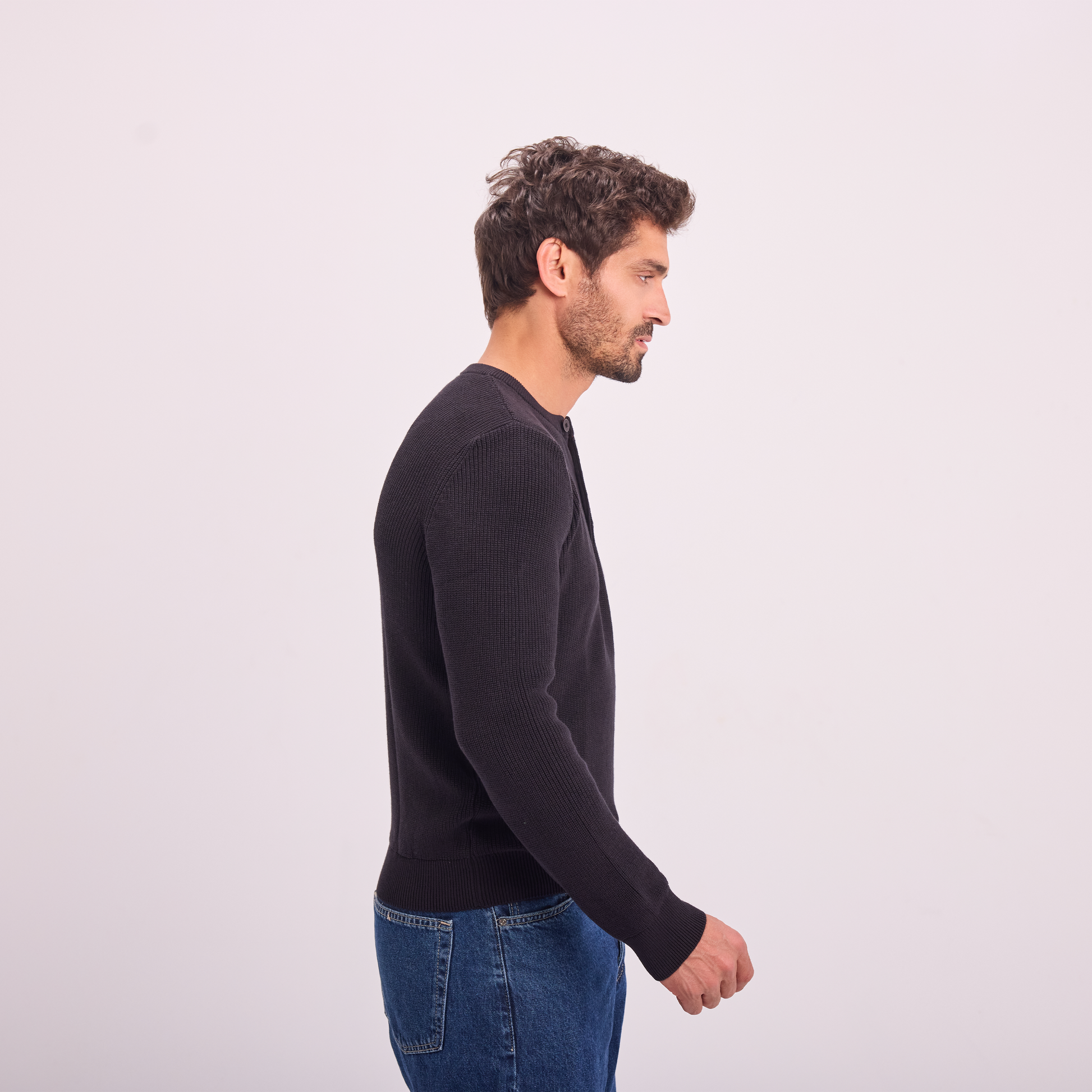 A refined knit designed for effortless everyday style. This pullover features a subtle textured fabric and a buttoned neckline, delivering a clean, modern look. Easy to wear on its own or layered.