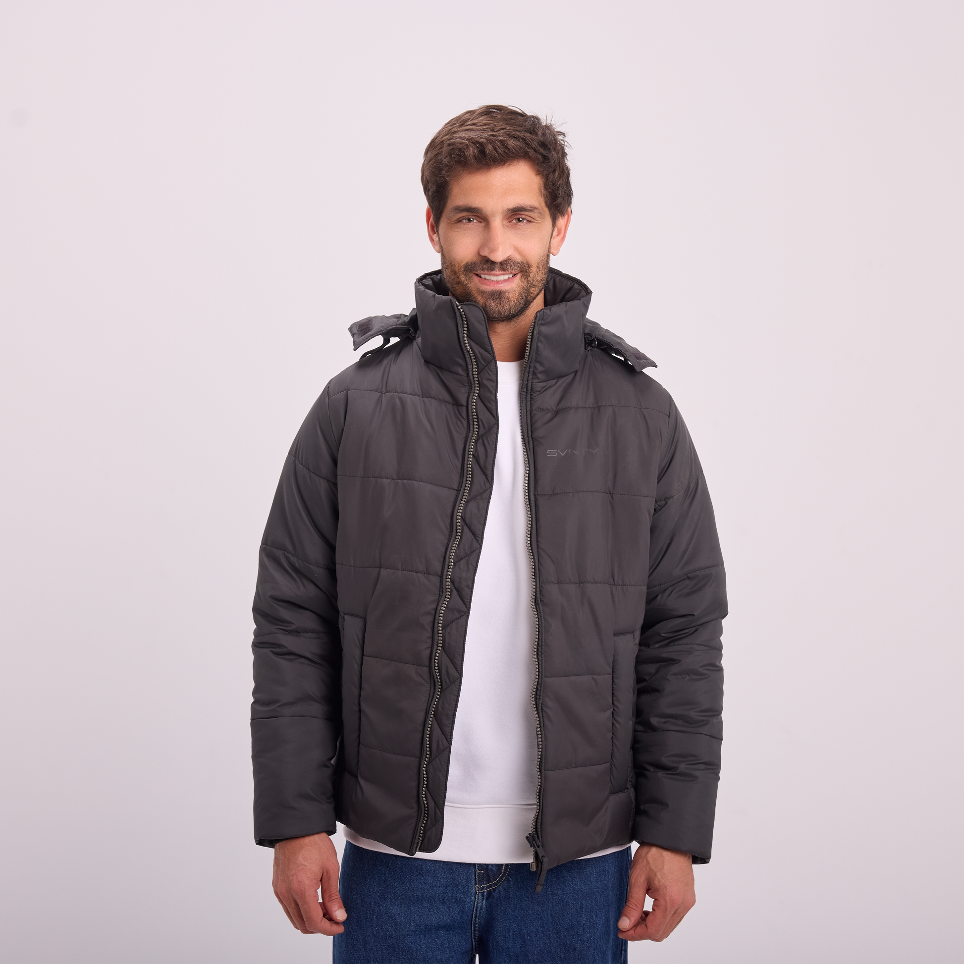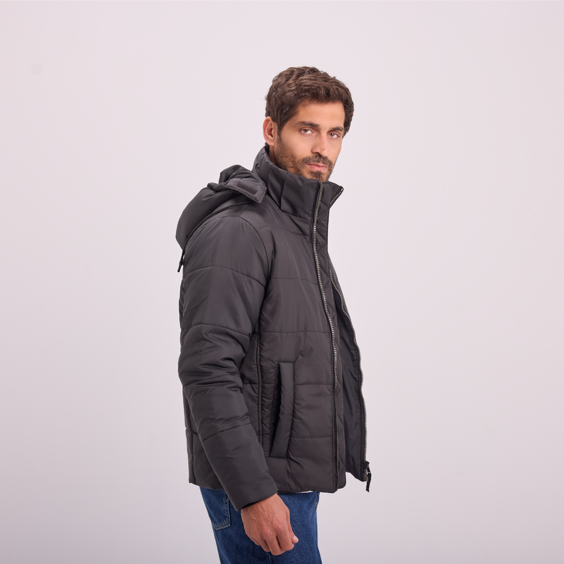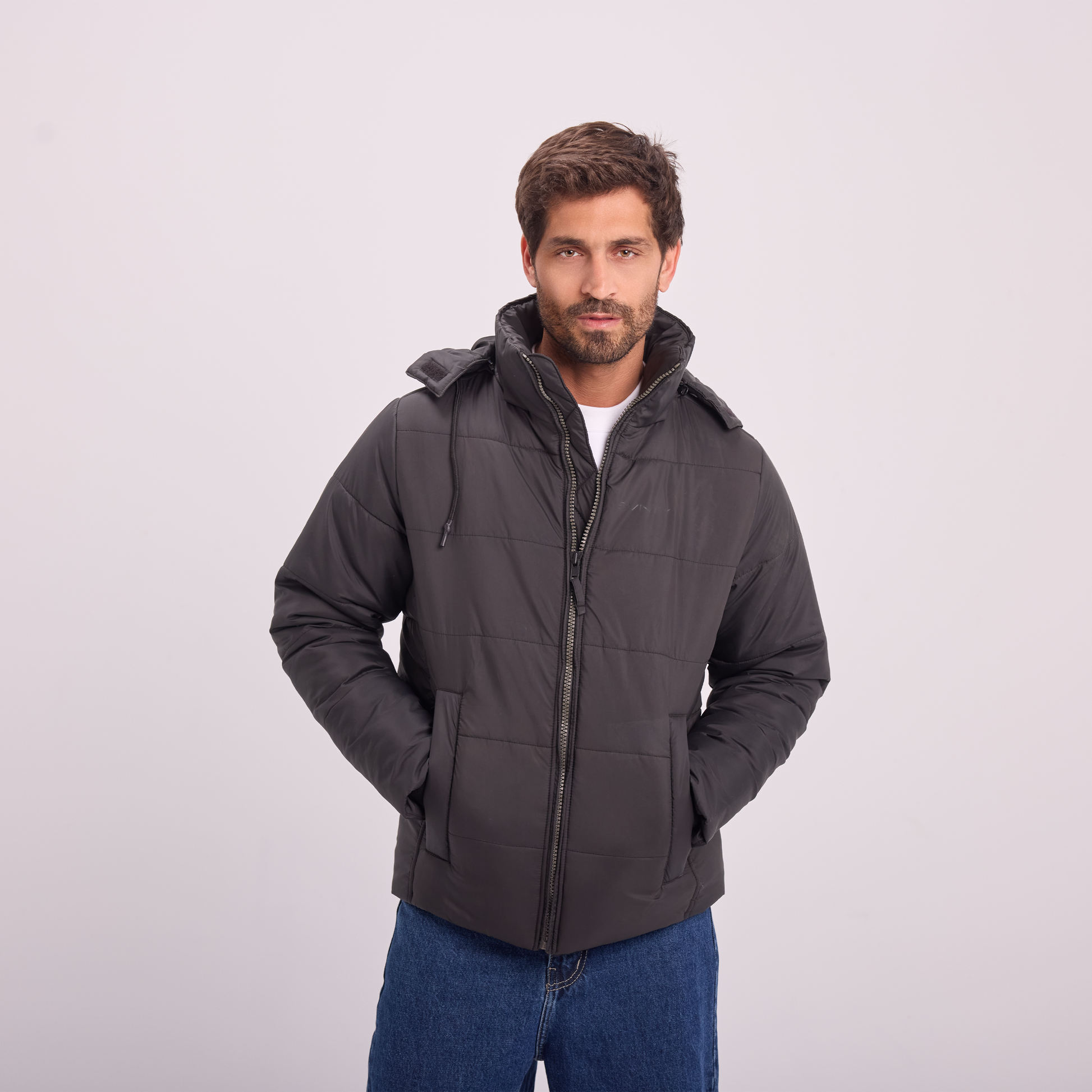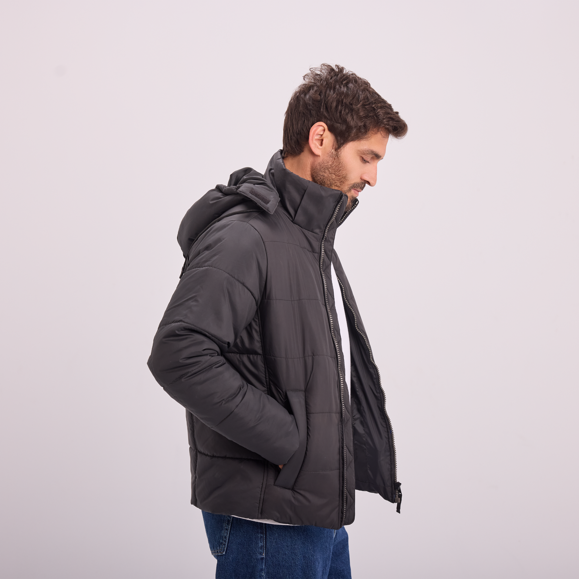 A warm, lightweight puffer jacket designed for everyday winter wear. Features a padded construction, full zip closure, and a hood for added protection against the cold. Clean, modern, and easy to style.