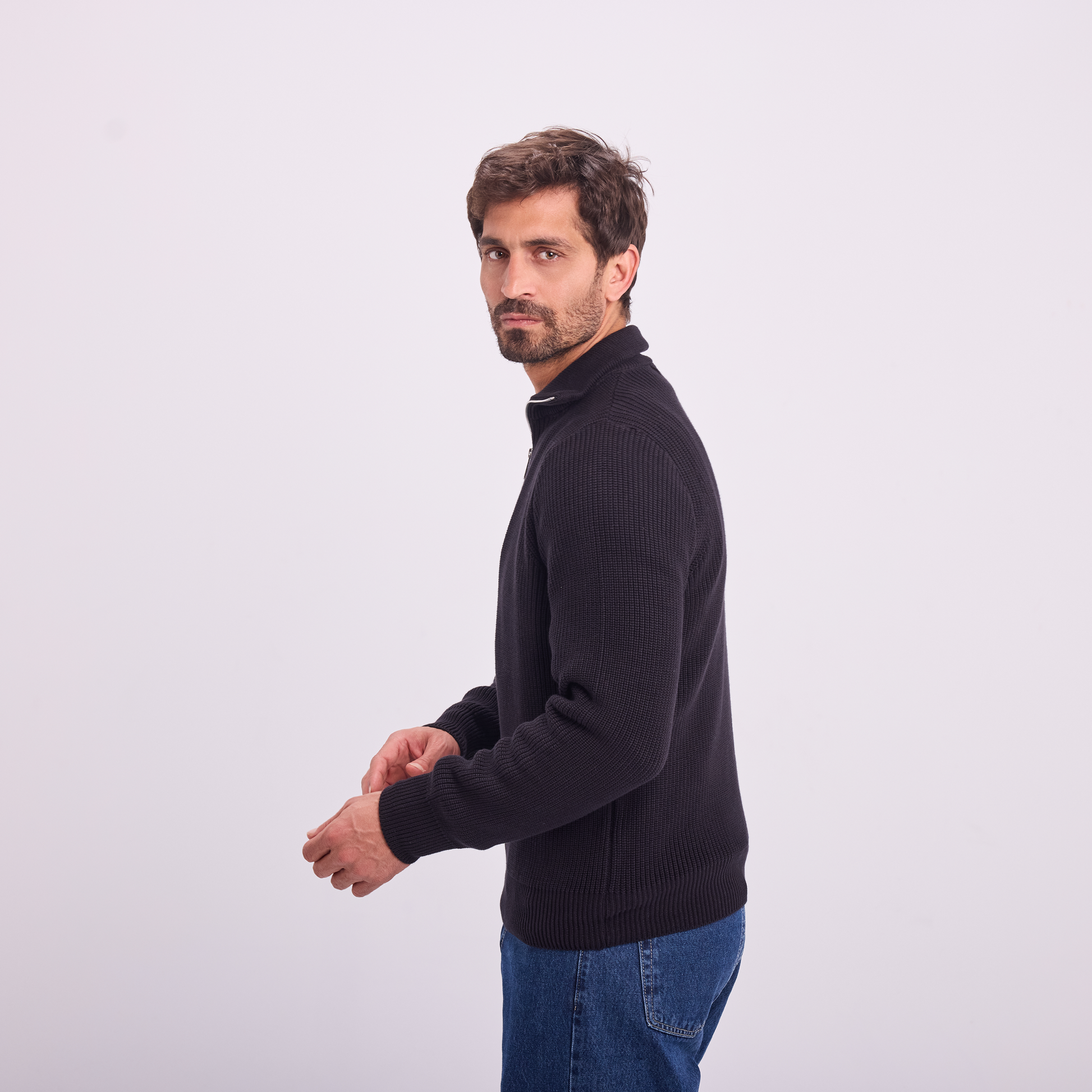 The Quarter-Zip Knit Pullover features a textured knit fabric that feels soft yet durable.